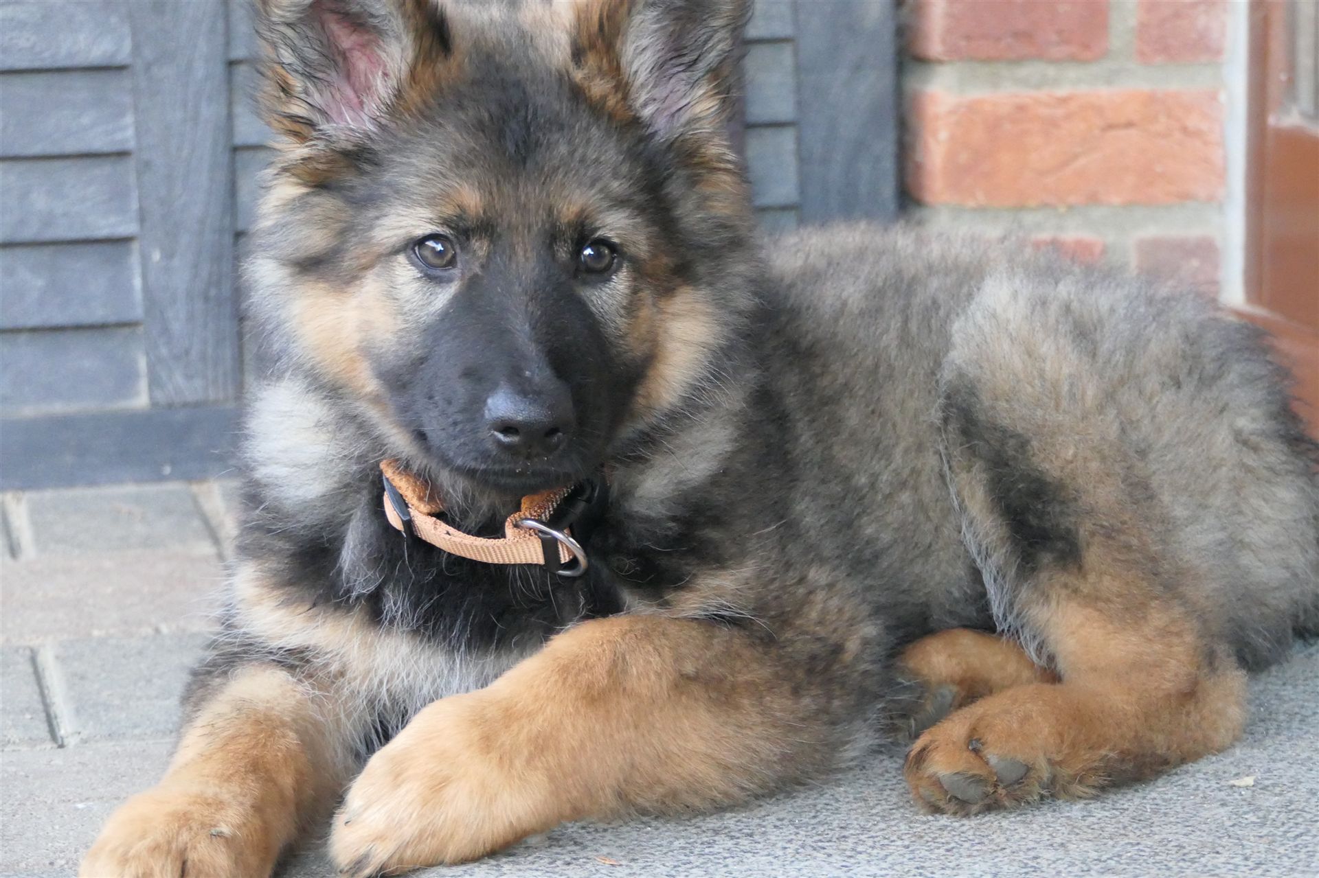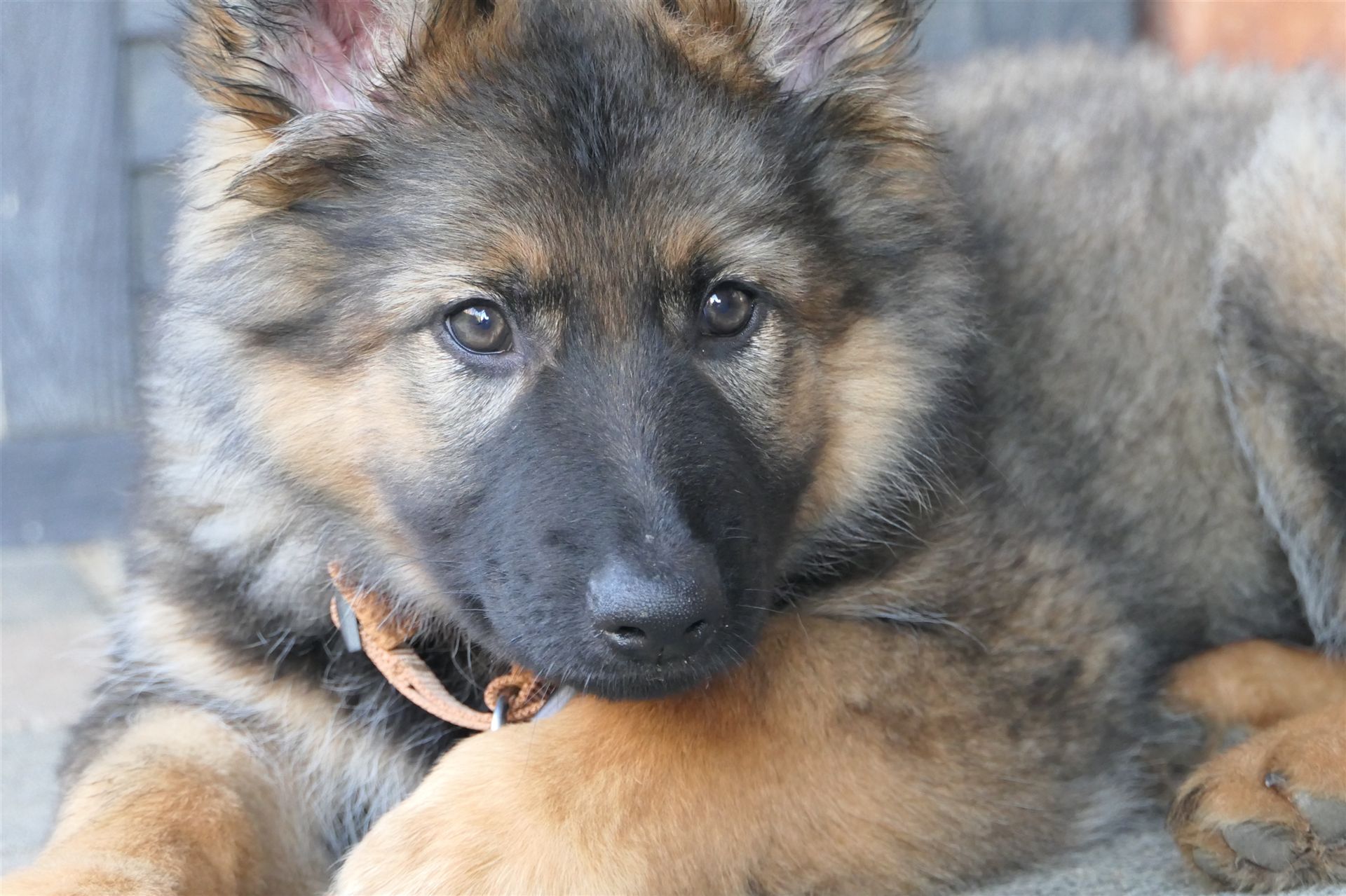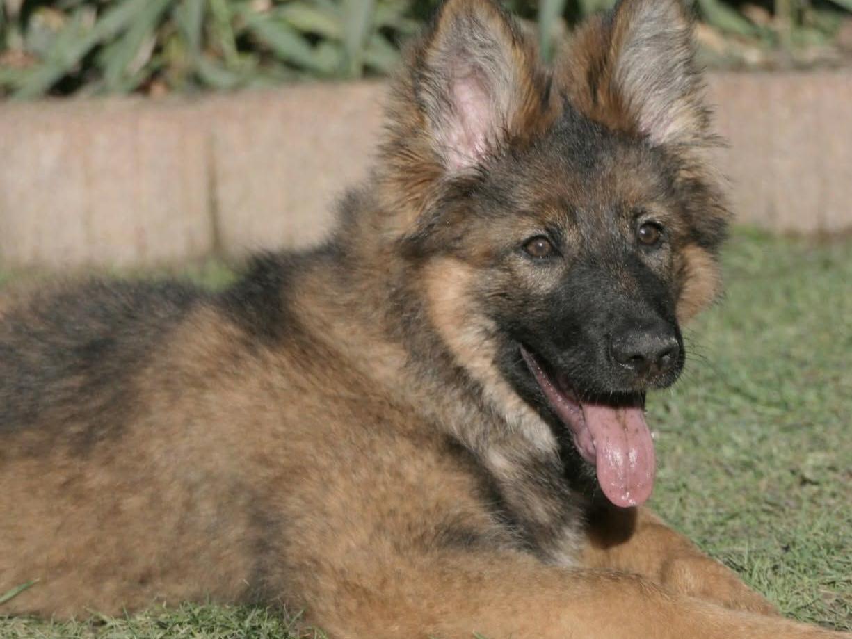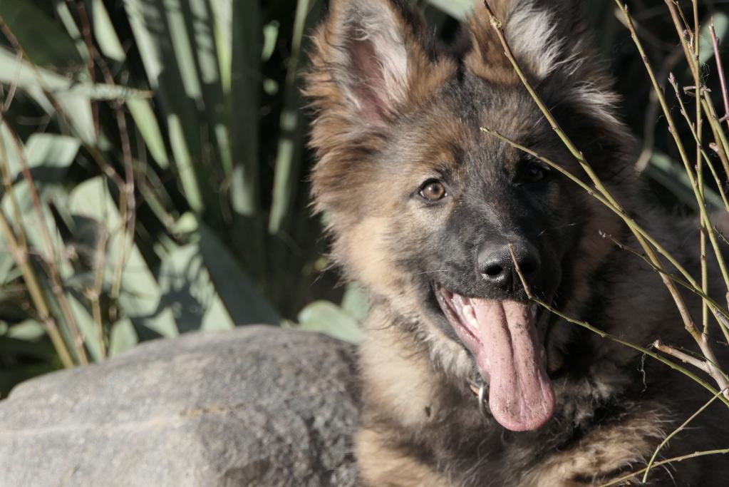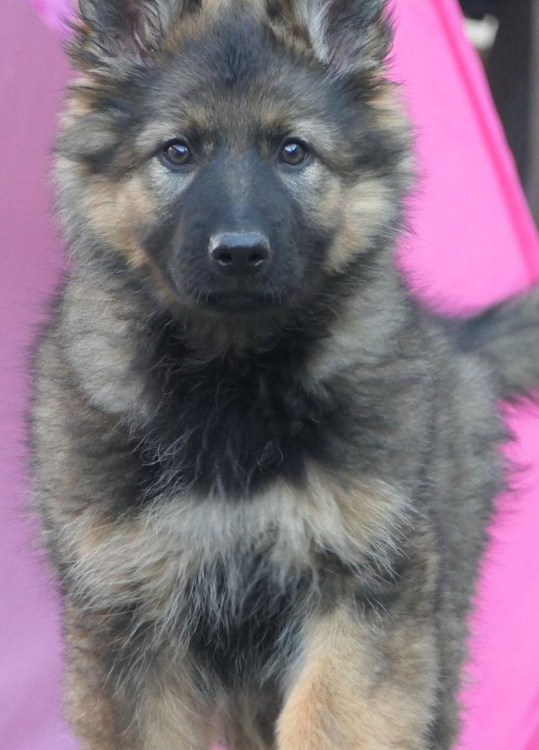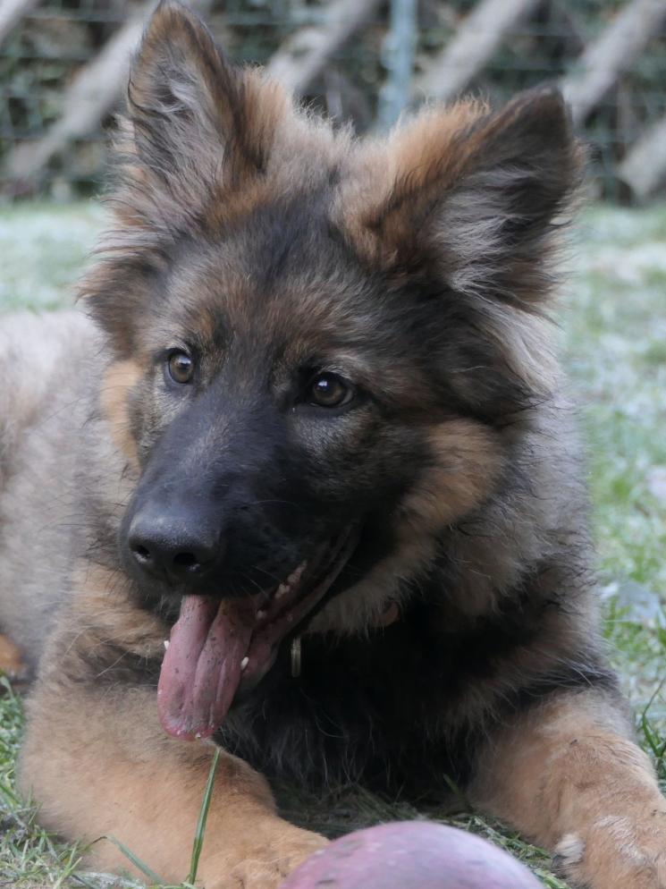 Sie ist eine langstockhaar (mit Unterwolle) Schäferhündin in der Farbe dunkelgrau-braun und ein richtiger Wirbelwind.